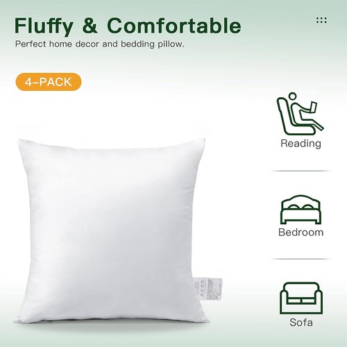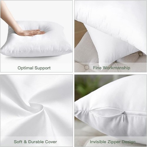 THROW PILLOW INSERTS - The pack of 4 superior quality pillows is expertly woven and sewn to perfection. PREMIUM QUALITY - Our pillow inserts boast a 100% cotton cover and ample 3D high-quality fillings.The breathable and skin-friendly materials provide optimal support, ensuring a comfortable experience whether you're lying down or leaning against them. VERSATILE USAGE - These square pillows are multiuse wonders, suitable for sofas, chairs, beds, and more.They can be easily inserted into pillowcases of various styles, allowing you to effortlessly decorate your room to reflect your unique taste. EASY MAINTENANCE - Our pillow inserts are designed for hassle-free care.Simply hand wash or machine wash them in a gentle cycle, and then tumble dry on low heat. The hidden zipper allows for easy removal or addition of fillings, enabling you to adjust the loft to your liking. PACKING - Shipped vacuum packaged, these pillow inserts will fully fluff up within a couple of hours.For maximum fullness, we recommend buying one size larger than your pillowcases.